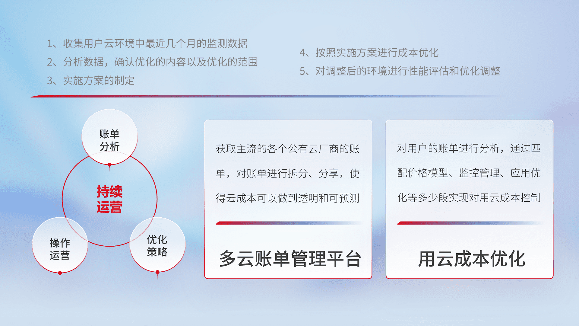 通过灵活运用多种自动化迁移工具,,,帮助企业用户实现业务和数据高效 、、稳定的上云迁移和云上迁移,,,采用自研多云纳管平台,,,以中立管理模式,,,解决多组织、、多云、、、、多运维厂商的复杂关系的管理,,,,保证多云平台资源配置的一致性,,,,实时掌控云资源运行数据,,,运用智能化工具分析云资源多云平台的管理服务,,,,透明化管理成本支出,,,用云成本可预测、、、、用云费用可优化、、、云资源配额有据可依。。。。