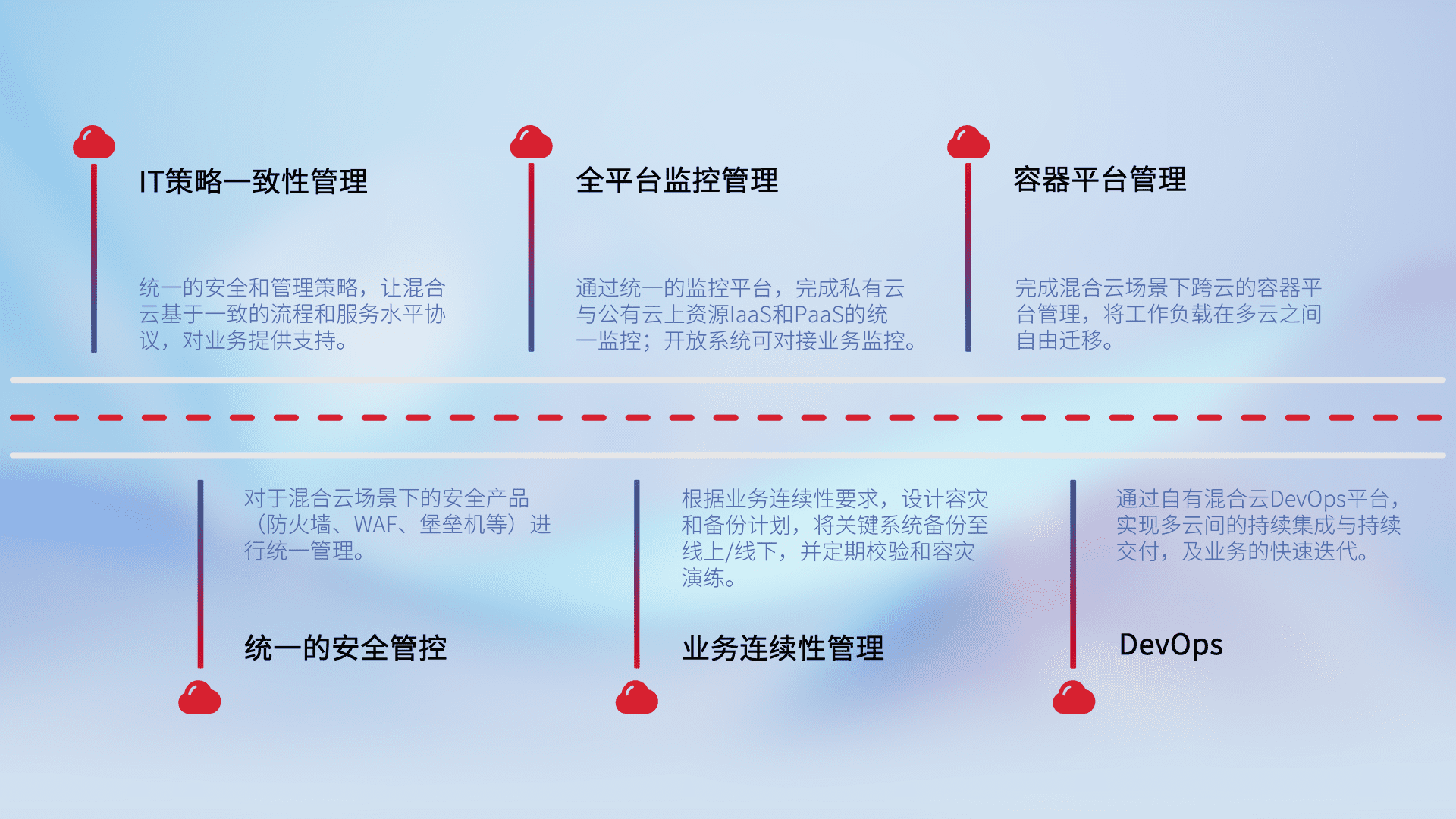 通过多云纳管,,,以统一的资源数据模型把客户的云资源进行抽象和封装,,,,进而实现对多云资源的统一操作,,,,保障云资源管理的可靠性、、稳定性与可用性。。量身定制化运维内容,,,,配置、、、、开发运维、、、补丁管理、、、备份、、、监控、、、、认证和访问管理、、、、审计和日常巡检等,,,保障在用云过程中的可靠度,,,稳定度以及高可用率。。。