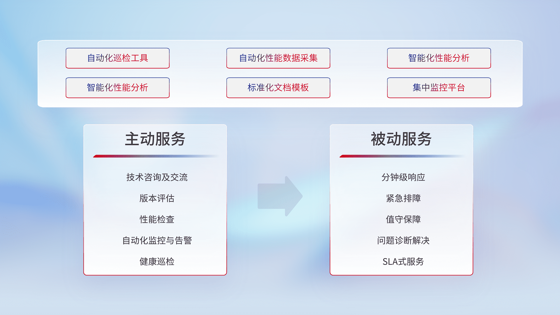 智能化工具和标准化文档,,,保障服务质量,,,,提供主动服务(包含技术咨询、、版本评估、、、性能检查、、自动化监控与告警、、健康巡检)和被动服务包含(分钟级响应、、、紧急排障、、、、值守保障、、、、问题诊断解决、、SLA服务)。。。