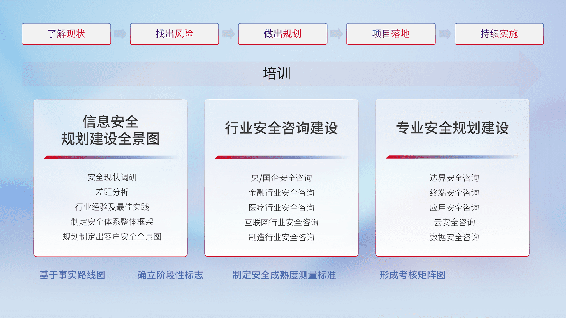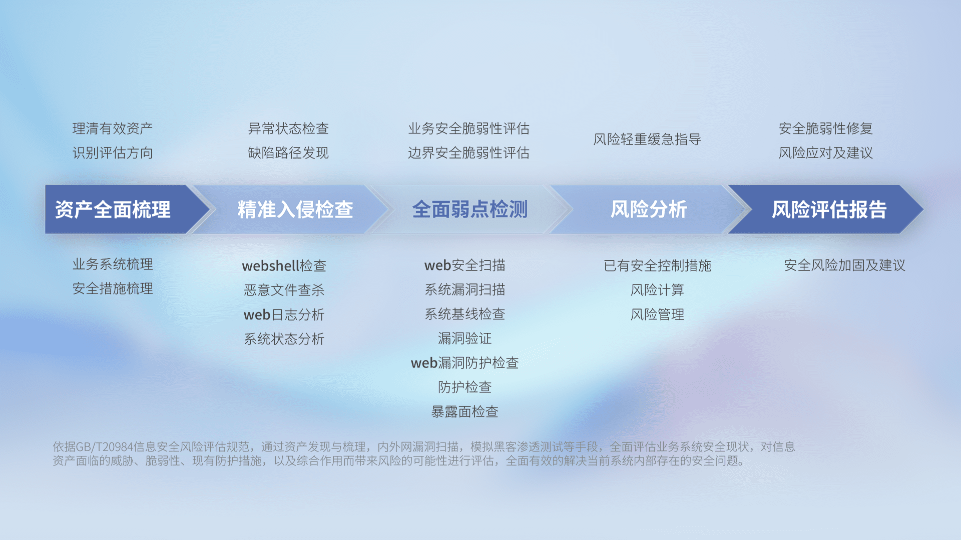 针对客户行业特性,,,,以专业的安全服务+多厂商联合解决方案提供专属的一站式安全管理服务,,,帮助客户全面感知网络空间威胁,,基于识别、、检测、、分析、、防护、、、、监测、、、、响应的服务理论模型,,,从方案咨询、、、集成交付、、、评估验证、、、、优化加固、、、、运维运营,,致力于为客户提供完整的闭环管理式安全服务。。以实战经验为客户打造高抵御风险的安全体系,,,,帮助客户发现威胁、、对抗威胁、、、处置威胁,,不断积累安全对抗能力,,持续保障数字化安全。。。。